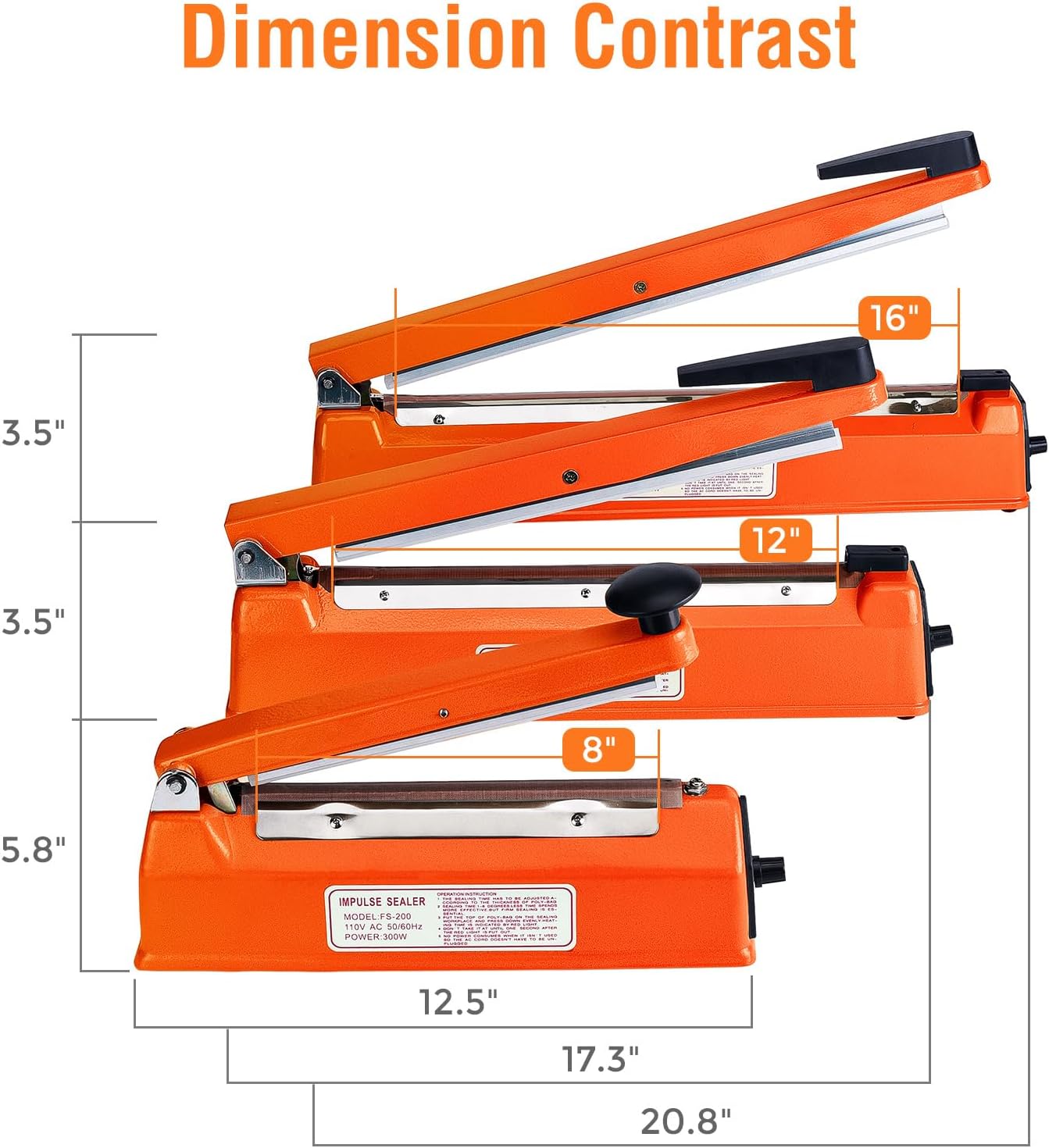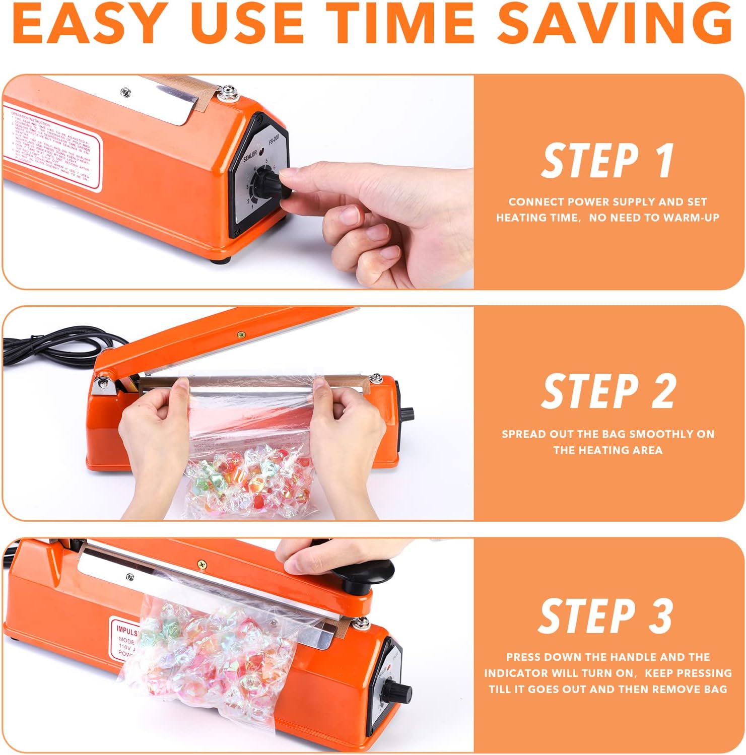 - No Warmup Time Needed --- No warmup or cooldown time is needed, safe, and simple to use. Impulse sealers are very convenient and safe because they can be immediately used, and the chance of being burned is minimal. An impulse sealer can save your business time and money. The impulse sealer will only apply heat whenever the arm is down and in contact with the material and base. This means a safer work environment and the ability to seal packages quickly for shipping or storage.