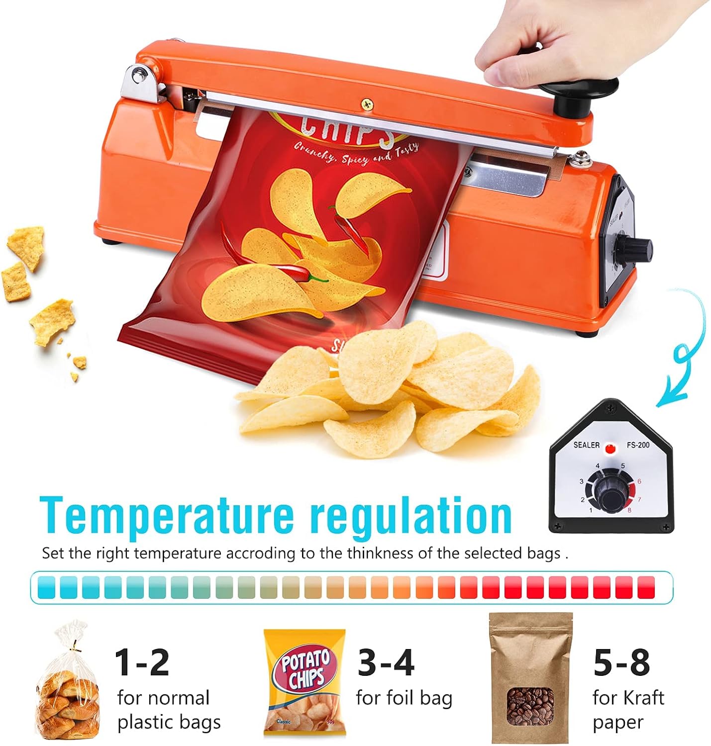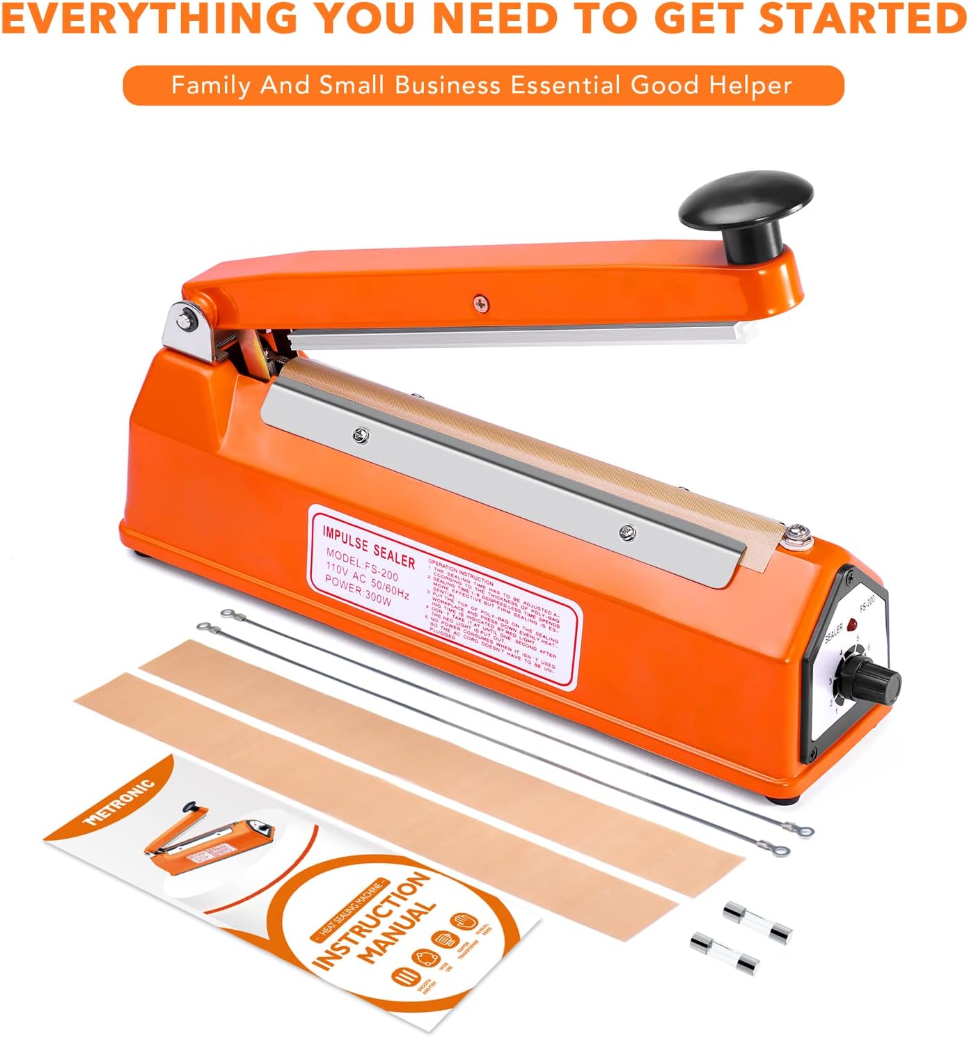- Safe and Easy to Use --- Metronic impulse sealers are safe and easy to use. The heating element in the impulse sealer is not constantly heated. Once pressure is applied to the sealing arm, the heat sealer quickly seals the material and creates a seal. The light will turn on when the sealer is activated and will turn off once sealing is completed. Use the appropriate heat setting for your material. Heat-sealed bags make sure that your products are airtight, water-resistant, and tamper-proof.