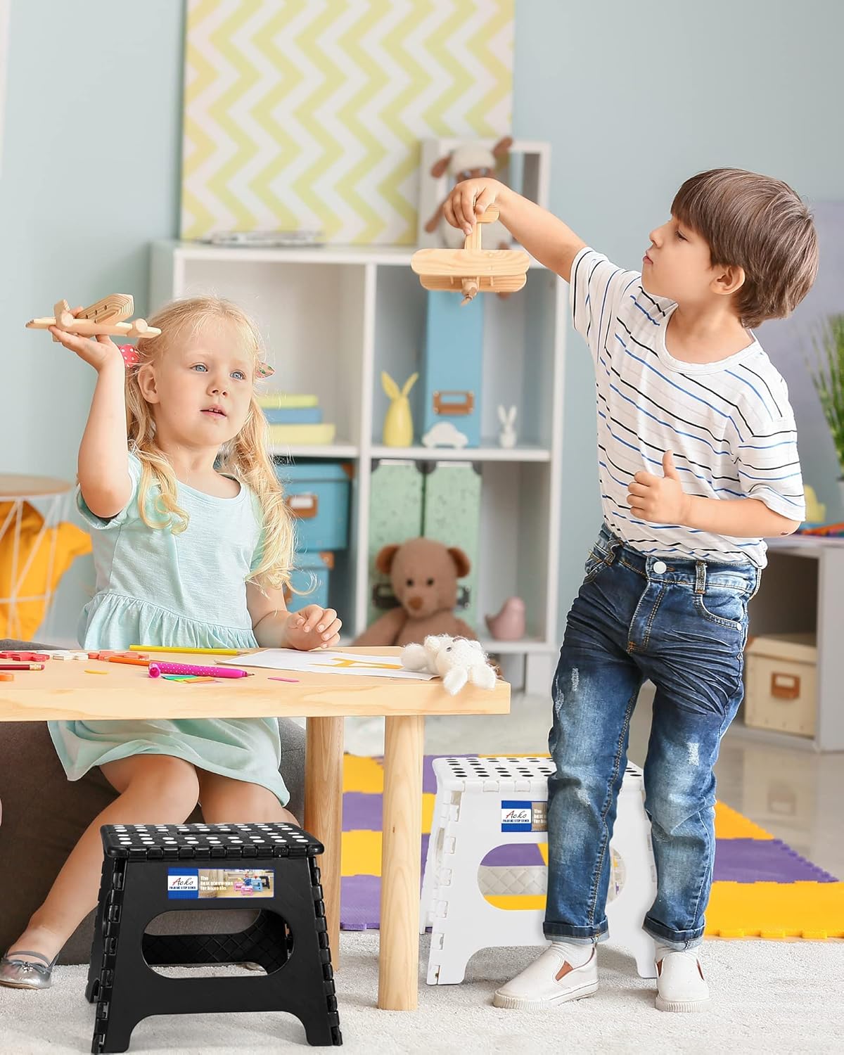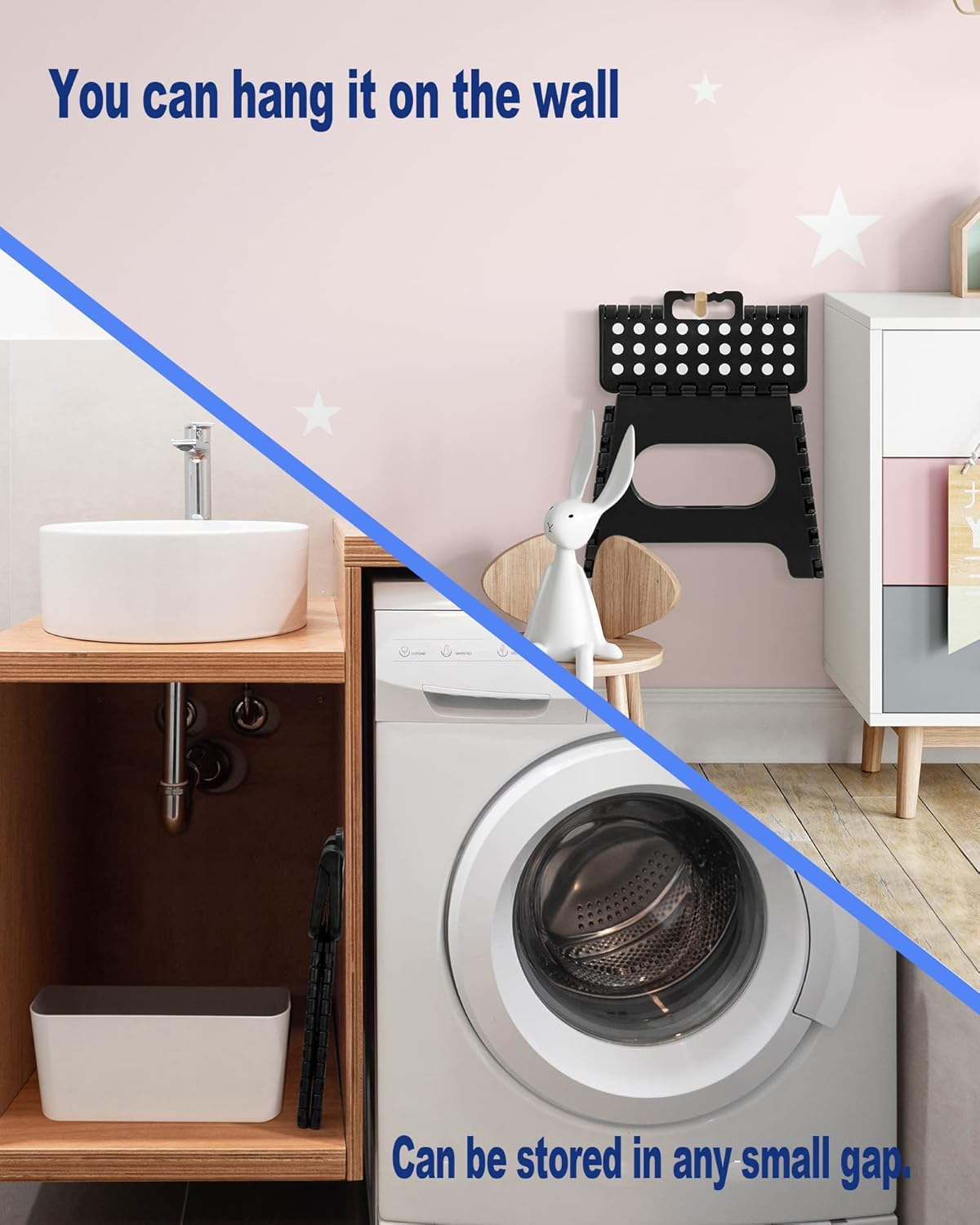 • CARRYING HANDLE - Ergonomic carrying handle is designed for easy folding and carrying. Just lift the handle, it will fold easily and quickly in a split second with only one hand. The step stool’s handle magically appears when the stool is folded flat. Allowing you comfortably carry it around so they can place it where they need it.