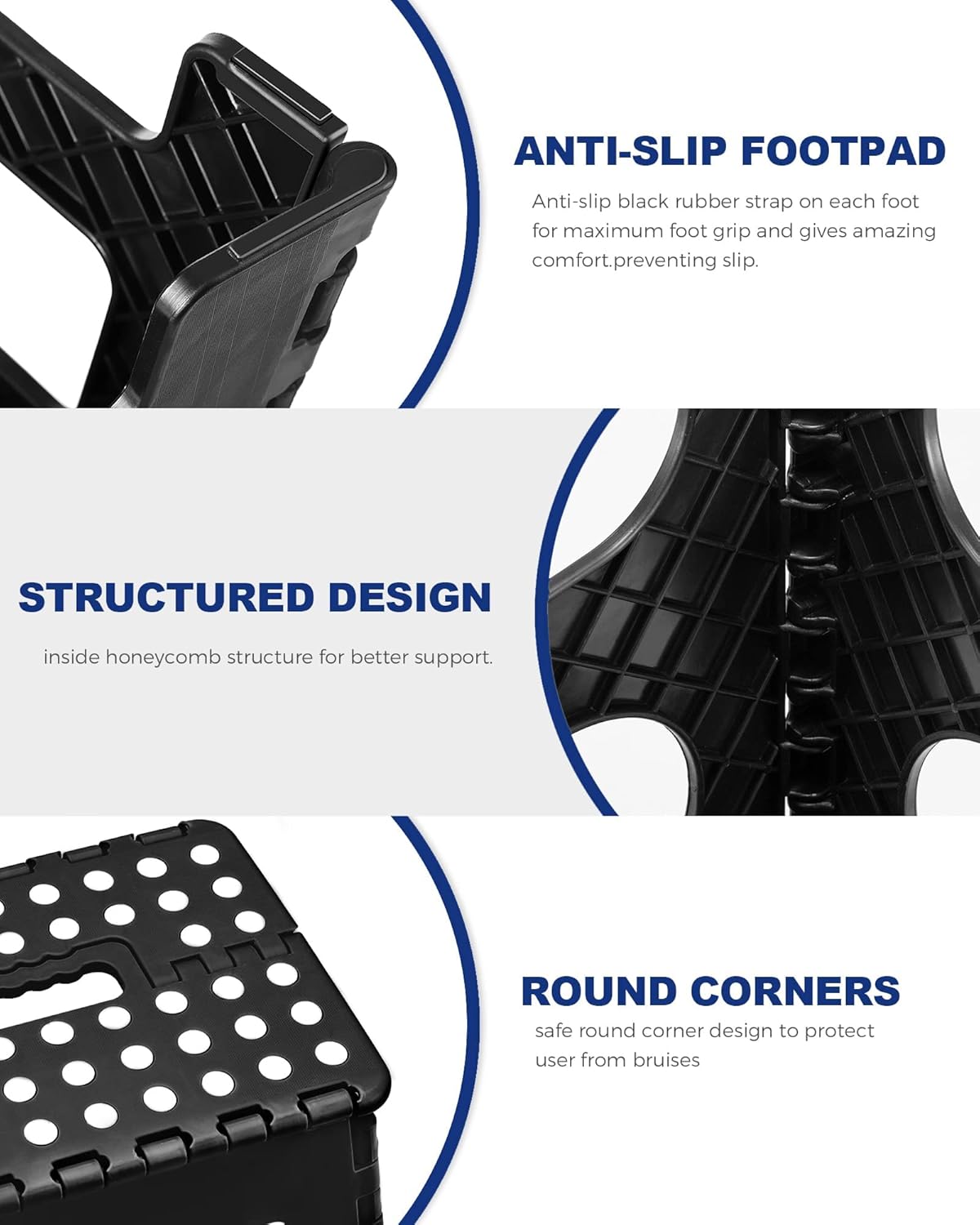 • ANTI SLIP - Special rubber dots on the surface and anti-slip black rubber strap on each foot for maximum foot grip and gives amazing comfort, preventing slippage. Unique, grip-dot textured surface makes the folding step stool safe for everyone. This safety features making the step stool great for multipurpose uses i.e. kitchen, bathroom, dining room, office, garden, camping, fishing and more.