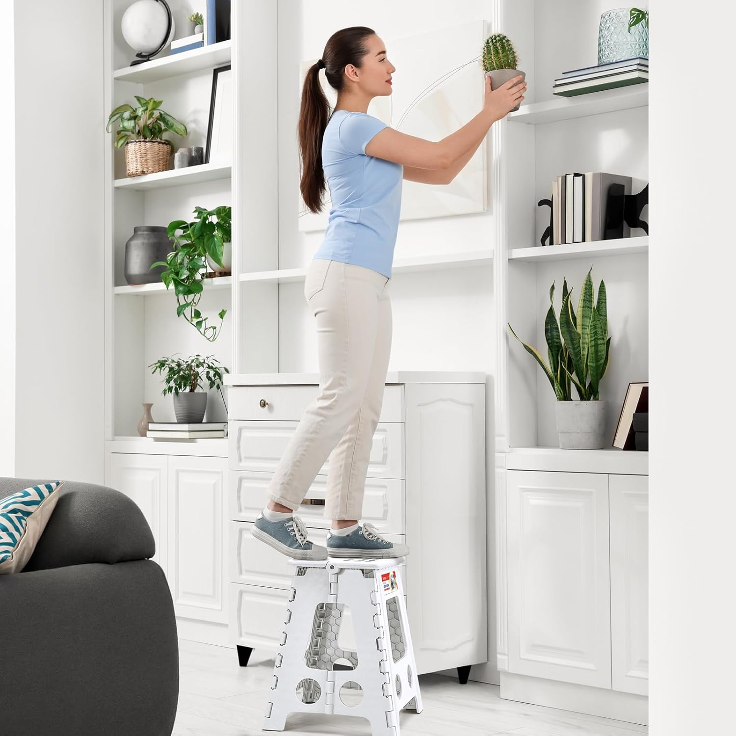 • ANTI SLIP - Special rubber dots on the surface and anti-slip black rubber strap on each foot for maximum foot grip and gives amazing comfort, preventing slippage. Unique, grip-dot textured surface makes the folding step stool safe for everyone. This safety features making the step stool great for multipurpose uses i.e. kitchen, bathroom, dining room, office, garden, camping, fishing and more.