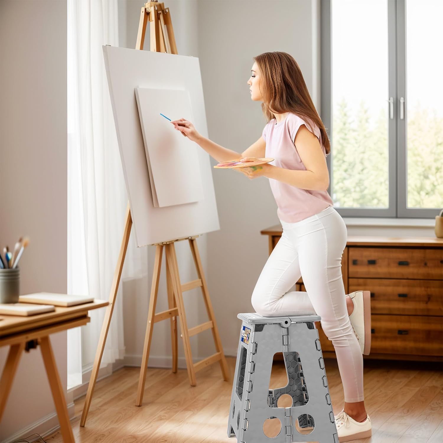 • CARRYING HANDLE - Ergonomic carrying handle is designed for easy folding and carrying. Just lift the handle, it will fold easily and quickly in a split second with only one hand. The step stool’s handle magically appears when the stool is folded flat. Allowing you comfortably carry it around so they can place it where they need it.
