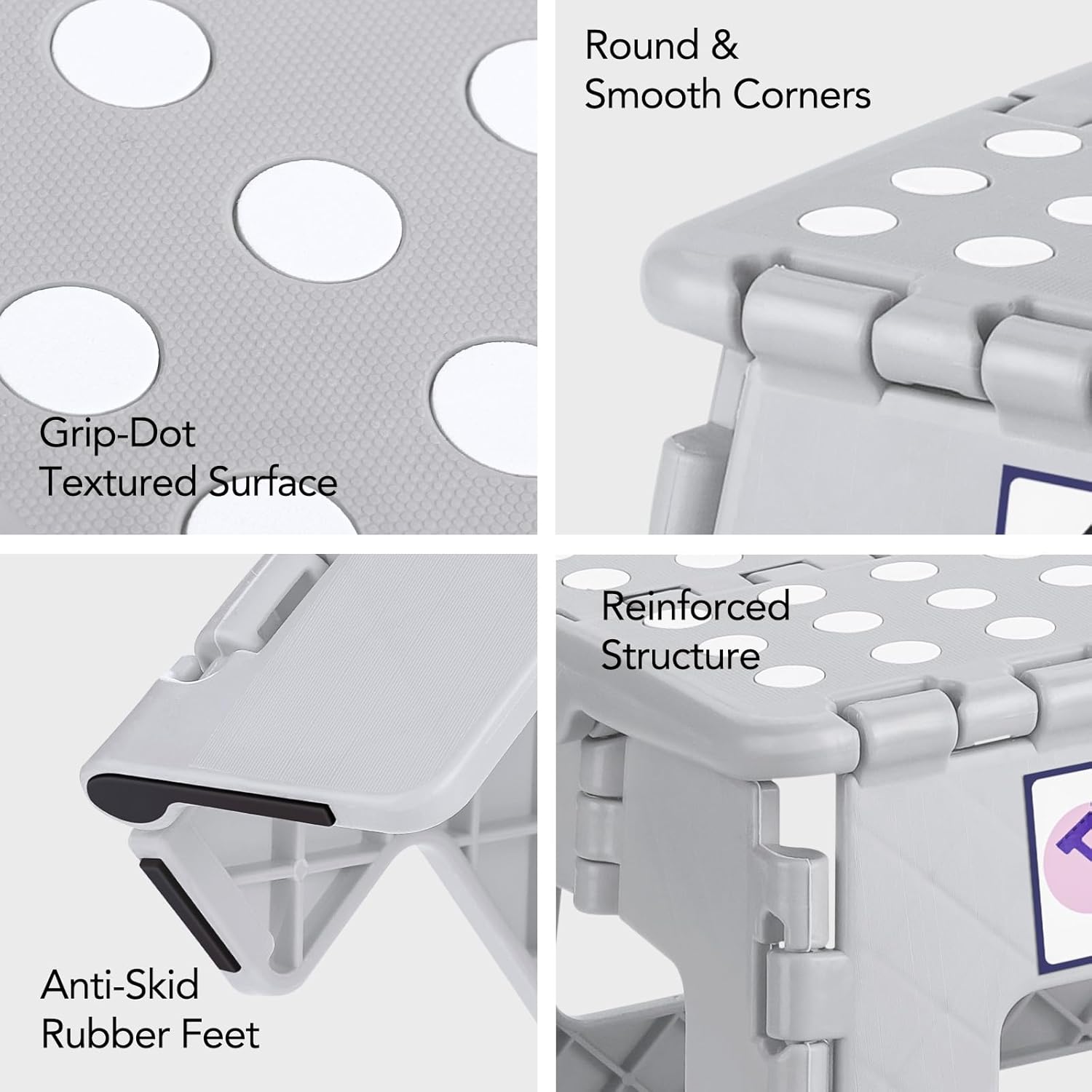- Collapsible One-Step Stool : The grip-dot textured surface, anti-skid rubber feet design, and smooth rounded edges of this collapsible step stool makes it extra safe for children to use as they are protected from possible bruises that can result from sharp edges. It comes with a handle making it easy to carry around at home or outdoors when needed